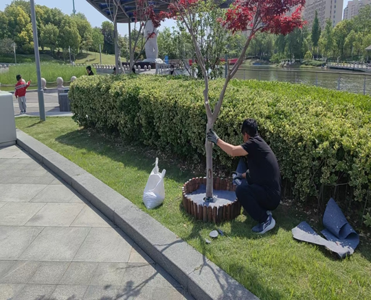 在施工現(xiàn)場(chǎng),養(yǎng)護(hù)人員將回收木樁截取統(tǒng)一長(zhǎng)度,精心配色組合使用環(huán)保彩漆涂刷橫截面,將原本單調(diào)的樹(shù)穴打造為充滿藝術(shù)氣息的“五彩景框”,顯著提升了公園整體景觀效果。