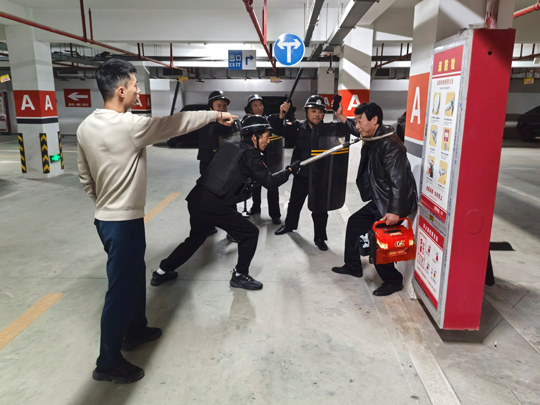 與此同時,應(yīng)急處置崗隊員也攜帶防暴盾牌、橡膠棍等專業(yè)器械火速集結(jié),以最快速度抵達(dá)地下車庫指定區(qū)域。面對負(fù)隅頑抗的 “盜竊分子”,隊員們沉著冷靜,憑借日常訓(xùn)練形成的默契配合,迅速結(jié)成戰(zhàn)術(shù)小組,從不同方向?qū)?“盜竊分子” 實(shí)施包圍,果斷出擊、動作規(guī)范,僅用數(shù)分鐘便成功將其治服,并移送公安機(jī)關(guān)處理。