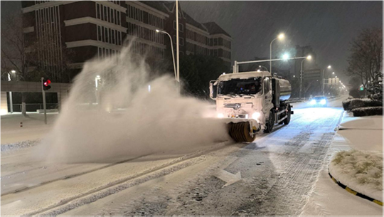 為確保城市主干道及橋梁暢通,建發(fā)公司緊抓夜間作業(yè)窗口,秉持“人歇車不歇”原則,調(diào)配精良設(shè)備與人員,對易結(jié)冰的橋面及主干道進(jìn)行高強(qiáng)度清除作業(yè)。作業(yè)人員利用后半夜車流較少的時機(jī),集中操作雪滾車、撒布機(jī)等設(shè)備,并同步在關(guān)鍵路口鋪設(shè)防滑墊。截至20日17時,累計投入各類機(jī)械16臺、作業(yè)人員320名,撒布融雪劑60噸,有效保障了主要道路的安全通行。