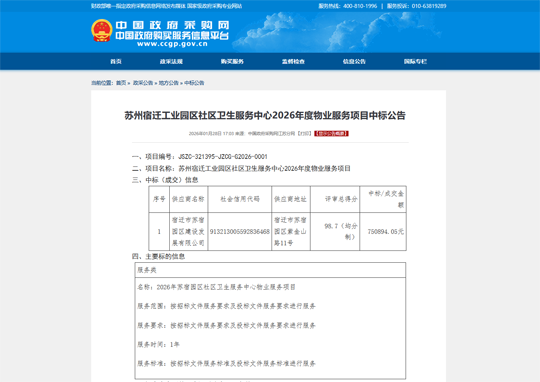 近日,建發(fā)公司成功中標(biāo)蘇州宿遷工業(yè)園區(qū)社區(qū)衛(wèi)生服務(wù)中心2026年度物業(yè)服務(wù)項(xiàng)目。
