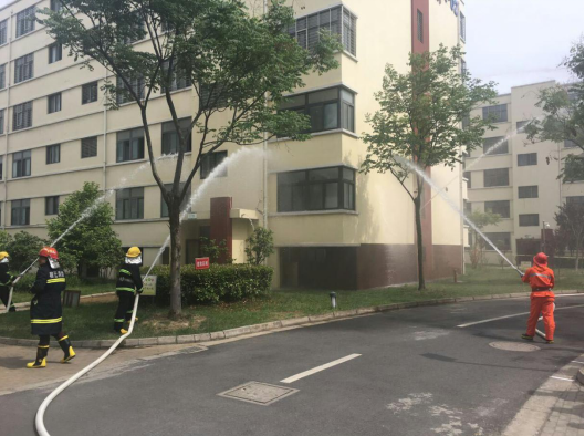 14:20分,園區(qū)公舍2號宿舍樓冒起滾滾濃煙,隨即刺耳的火災(zāi)警報(bào)聲響徹園區(qū),義務(wù)消防戰(zhàn)斗人員接到指示立即啟動消防三輪車奔赴火災(zāi)現(xiàn)場。不到一分鐘時(shí)間,一至六層的租戶在疏散人員的帶領(lǐng)下掩住口鼻,彎著腰,有序地從宿舍的消防安全通道逃生。隨即,消防戰(zhàn)斗人員按照指示迅速開啟消防水泵對“起火”后的宿舍樓進(jìn)行快速滅火,救護(hù)人員隨即趕到現(xiàn)場參加救護(hù),演練持續(xù)近五分鐘后圓滿完成。
